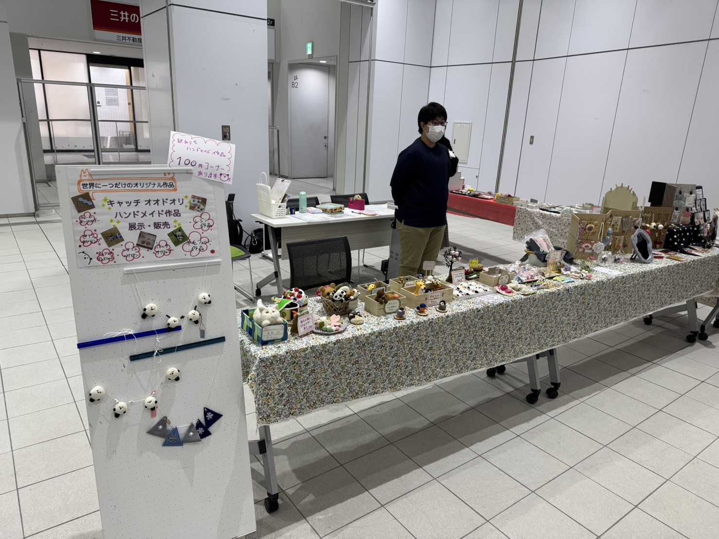 ブログ > スタッフブログ > キャッチオオドオリ ハンドメイド展示・販売 キャッチオオドオリ ハンドメイド展示・販売 2026年01月22日 みなさん、こんにちは。本日イベント広場では、キャッチオオドオリさんによるハンドメイド展示・販売が開催されました。 羊毛フェルトで作られた可愛い動物や、綺麗なヘアクリップやブローチなど魅力的な商品が数多くありました。 次回の開催もお楽しみに♪ この記事を共有する この記事をFacebookで共有する この記事をTwitterで共有する